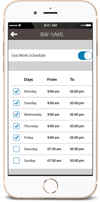 Drivers can set their custom work hours. Personal drives outside of “On Duty” hours will not be logged or given a score.